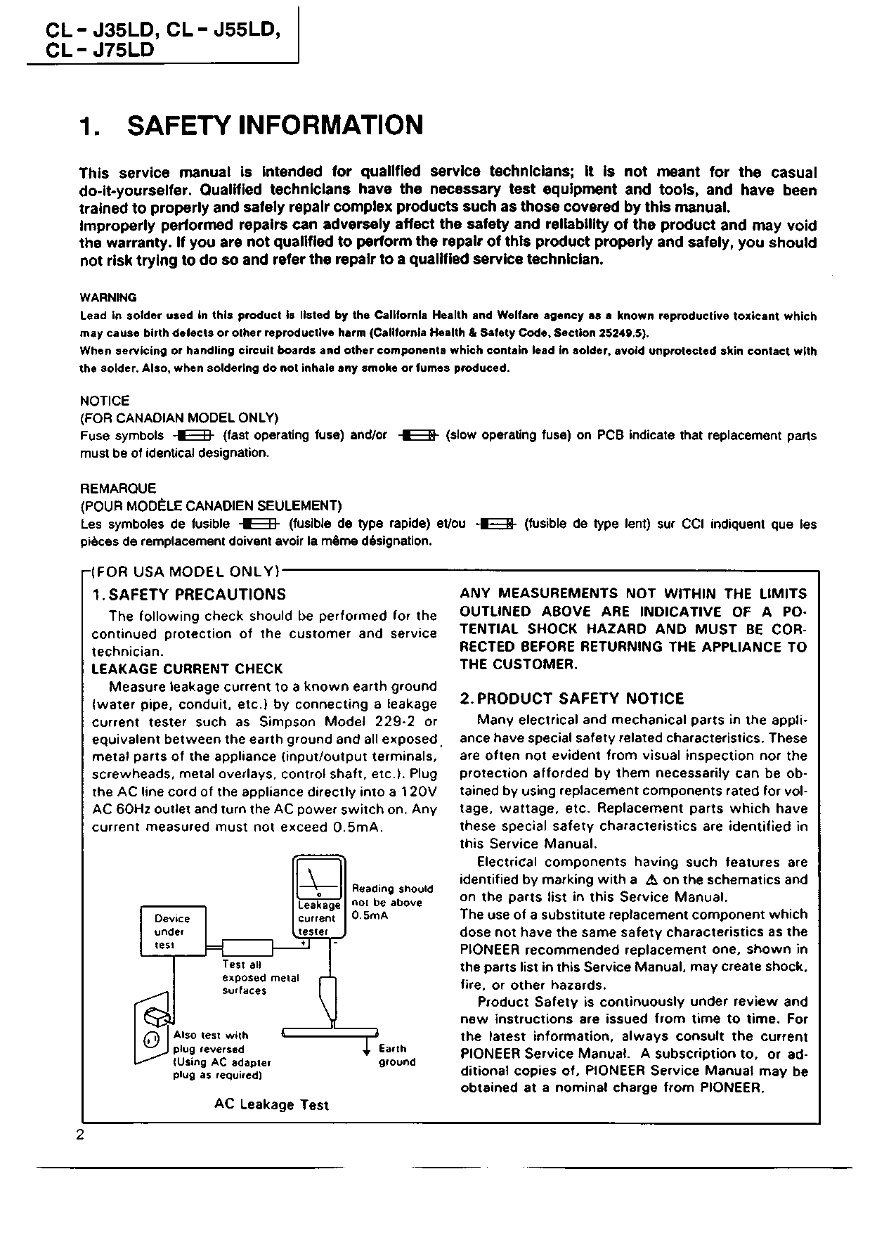 Pioneer CL-J35LD, CL-J55LD, CL-J75LD Service Manual (RRV1215) – Instant Download
