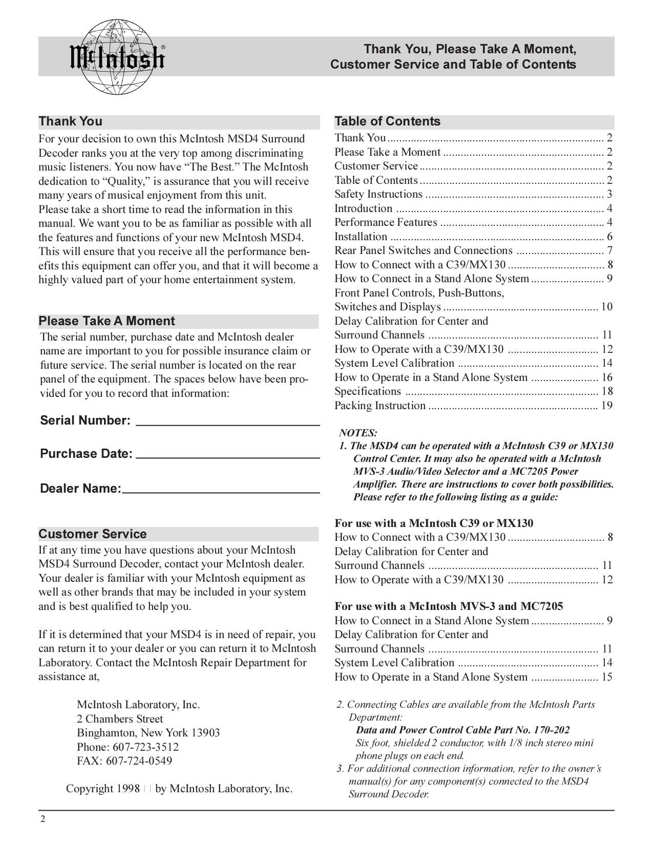 McIntosh Surround Decoder, Dolby Digital® (AC-3), DTS and THX MSD4 Owner’s Manual (Instant Download)