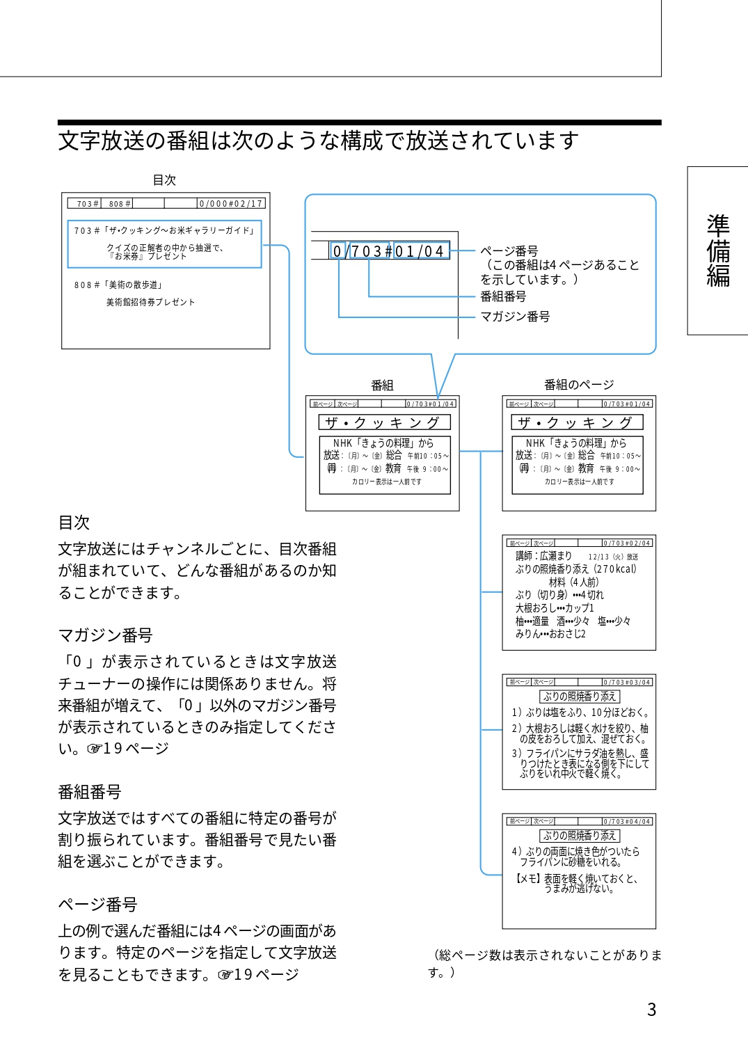 - Teletext Functionality (文字放送のしくみ): Explains that the text broadcast is composed mainly of text and illustrations, transmitted along with TV programs. It highlights the convenience of teletext, such as the ability to view desired programs at any time without waiting for a specific broadcast time, and the wide variety of programs available. It also mentions a convenient function for viewing frequently watched text programs by pressing the color buttons .