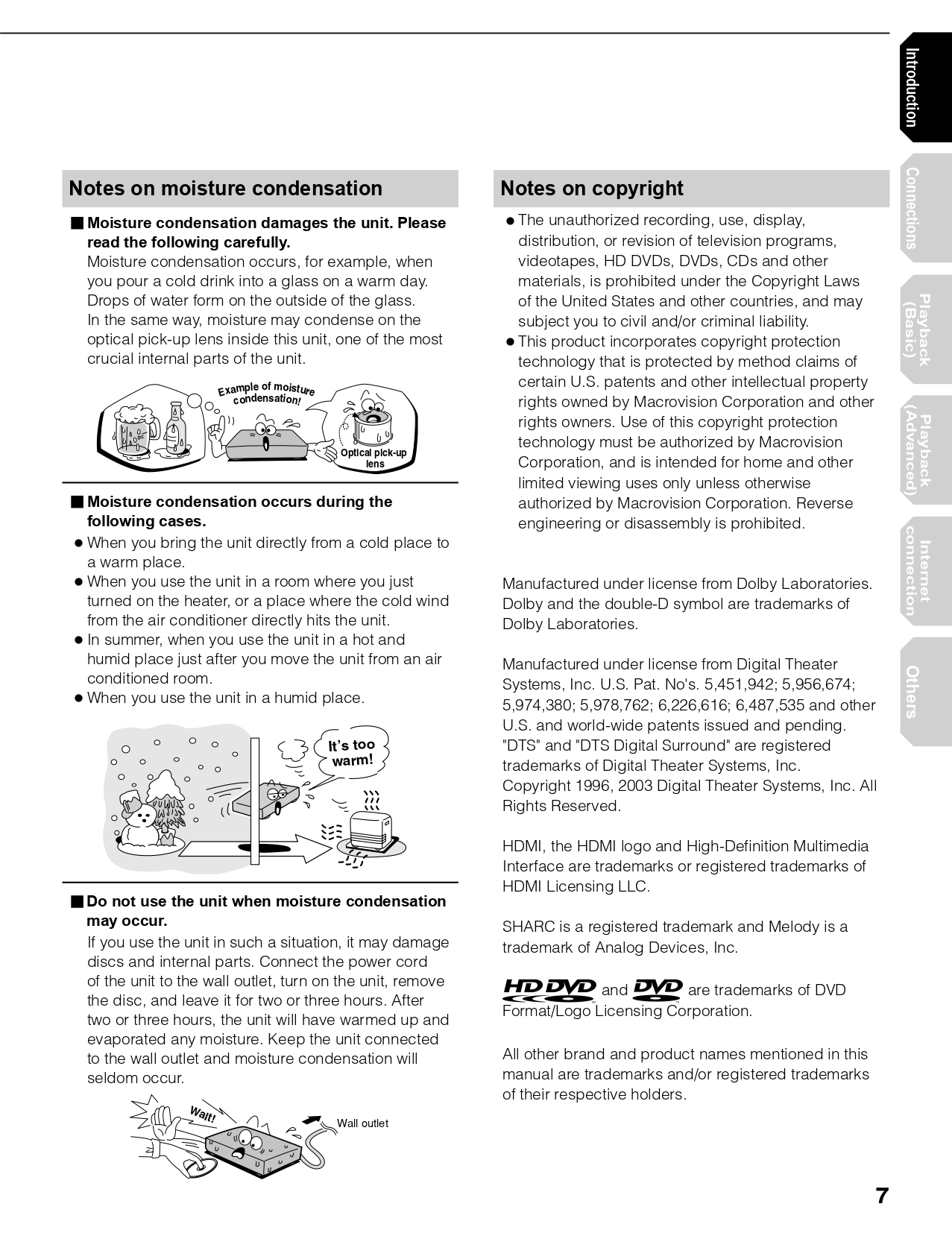 The manual is organized into several key sections, each designed to guide the user through different aspects of the HD DVD player. The Connections section provides detailed instructions on connecting the player to various devices, including TVs and audio systems, using HDMI and component video inputs. This ensures that users can enjoy high-quality audio and video output. The Playback section is divided into basic and advanced topics, covering everything from disc compatibility and loading to advanced playback features like repeat playback and playing MP3/WMA files. This section empowers users to explore the full range of playback options available with their device.